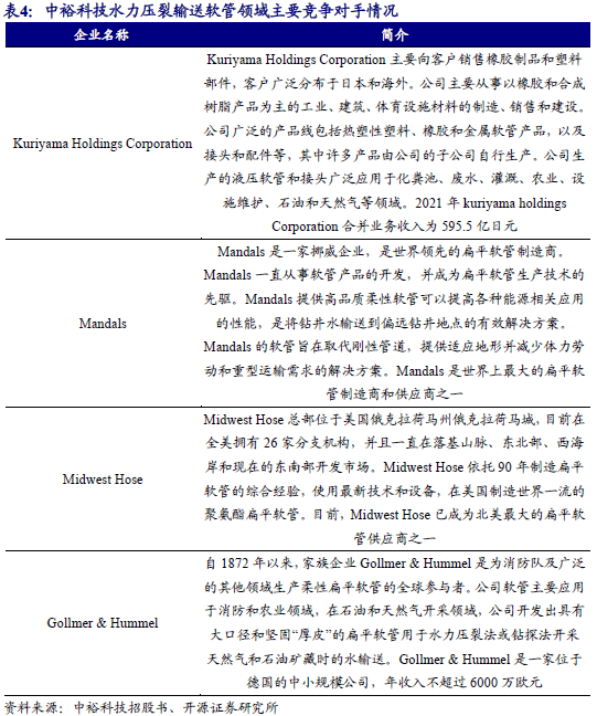 由于我国进入页岩油气开采领域的时间较晚,国内实现页岩油气压裂供水软管量产企业的数量较少,全球市场主要水力压裂供水软管企业均为国外的大型企业,包括Kuriyama Holdings Corporation、Mandals、Gollmer & Hummel、Midwest Hose等。海外企业凭借先发优势在高端产品市场具有一定的市场占有率,以公司为代表的中国企业凭借性价比优势和服务优势,正逐步扩大市场份额,发展速度较快。