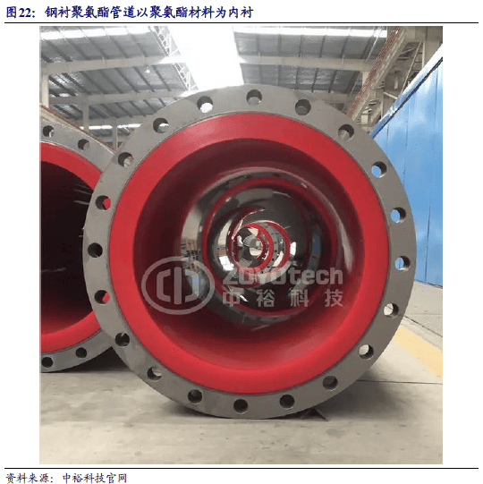 公司投资建设钢衬聚氨酯耐磨管量产项目,开辟矿产领域应用。钢衬改性聚氨酯耐磨管是以钢管作为外衬,聚氨酯作为内衬,采用浇注工艺一次整体成型的新型复合耐磨管道。钢衬改性聚氨酯耐磨管特别适用于粗颗粒、高压、高速介质的输送。钢衬聚氨酯耐磨管兼具钢管的强度、优异的弹性形变和耐磨耐低温性能,在工矿场景中能发挥较大的性能优势,大大增加了使用寿命,另外重量轻、易安装的特点也大大降低了人工成本,是目前性价比较高的采矿用管道之一。钢衬改性聚氨酯耐磨管目前主要的应用领域为各类金属矿山、油砂矿的开采。