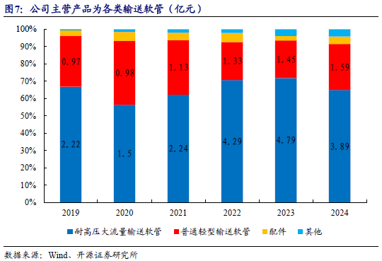 从营收结构来看,耐高压大流量输送软管和普通轻型输送软管是公司主要收入来源,二者收入合计占公司总收入的90%以上。2024年,耐高压大流量输送软管实现收入3.89亿元,普通轻型输送软管收入1.59亿元。