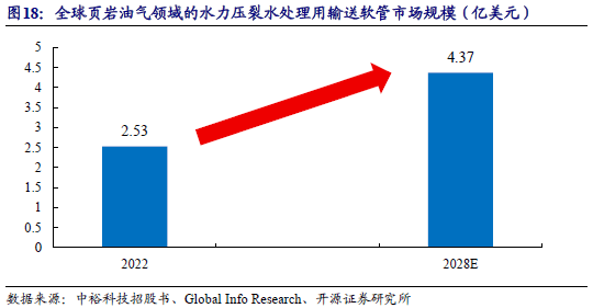 公司生产的页岩油气压裂供水软管是水力压裂技术开采页岩油的重要部件,主要用于页岩油田的远距离大流量高压供水。水力压裂技术是美国实现“页岩油气革命”的关键;2011年开始,得益于水力开裂技术的大规模应用,页岩油产量增长推动美国原油产量大幅增长,促使美国成为世界上最大的产油国。此外,沙特、中国等国家都在加大页岩油气资源的开采力度,据GIR数据,2022年页岩油气领域的水力压裂水处理用输送软管的市场规模约为2.53亿美元,预计到2028年将达到4.37亿美元,年复合增长率为 9.50%。