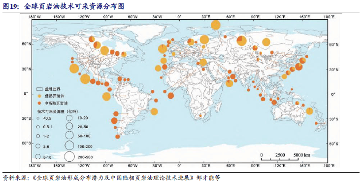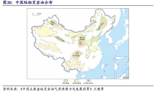 相较美国,中国陆相页岩油同样具有较大的资源潜力,根据《中国页岩油勘探开发研究进展与科学技术问题》(贾承造等)一文数据:自然资源部新一轮评估中国页岩油地质资源潜力为397.46×108 t,可采资源潜力为34.98×108 t。陆上中-高成熟度页岩油地质资源量约为283×108 t,是中国石油资源重要的战略接续领域。预计2030年中国的油气产量当量保持2.0×108 t 稳产,其中致密油1730×104 t、页岩油1 300×104 t, 合计3030×104 t,占总产量当量15%。未来,页岩油将成为石油稳产增产主力。