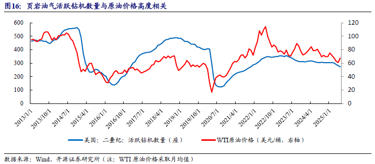 位于德克萨斯州西部的二叠纪盆地是美国最大且最富饶的页岩油产区,美国二叠纪活跃钻机数量可以反映美国页岩油气行业勘探开发的强度。通过对比二叠纪活跃钻机数量和WTI原油的走势发现,二者的相关性较强,同时活跃钻机数量走势相对于油价存在一定时间的滞后;当油价处于高位或者正处于上升阶段时,油气开采商会倾向于扩大投资,提高勘探开发强度,但由于从钻井到完井再到完全释放产能需要一定时间,这个时间差造成了对油价的滞后。所以油价是油气开采强度和产量的重要指标,当油价高位或者有上涨的预期时,其后一段时间内油气行业的勘探开发和生产都将处于活跃状态。