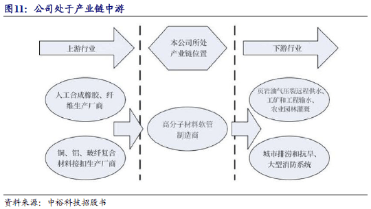 公司处于产业链中游位置,上游主要是人工合成橡胶、纤维和接扣的生产厂商;其中,人工合成橡胶主要包括TPU、NBR和EPDM,纤维主要为高强度聚酯纤维,接扣主要材质为铝、铜、合金材料或玻纤复合材料,按快速接扣、重型接扣等不同规格和标准进行制造。行业下游主要为具有水、石油等液体运输需求的终端用户,产品主要应用于页岩油气开采远程供水、工矿和工程输水、大型消防系统、城市排涝和抗旱、农业园林浇灌等。