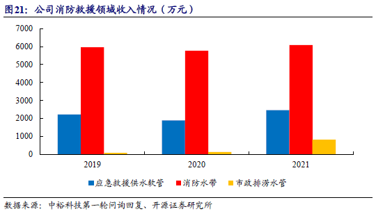 应急救援供水软管:主要应用于远距离消防供水、江河排涝及抗旱、城市饮用水输送等多种应用场景,其中远距离消防供水是指当火场距离水源较远或火势较大车内蓄水量不足时,利用若干消防车分别隔一段距离停放在供水线路上,依次连接水带,通过水泵加压将水运送到前车的消防车水罐内,供前车出枪灭火。应急救援场景下一般供水距离较远,要求产品具有重量轻、承压高、口径大、铺设及撤收速度快、机动灵活等性能。