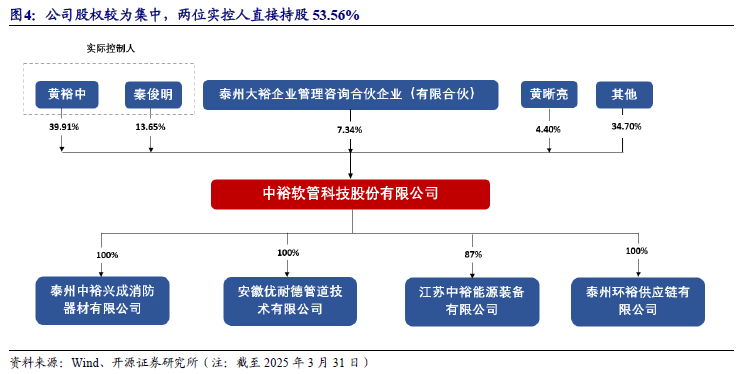 公司股权较为集中,两位实际控制人直接持股53.56%。截至2025年一季度末,公司实控人黄裕中、秦俊明夫妇直接持有公司53.56%的股份;泰州大裕为公司员工持股平台,持有7.34%的公司股份;黄晰亮为实控人黄裕中和秦俊明的一致行动人,持有4.4%的公司股份。公司股权较为集中,两位实控人能够对公司的实际经营决策、重大事项决策、人事任免等起控制作用,能够实际支配公司的行为。