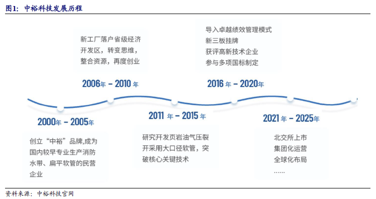中裕科技成立于2000年,是国家专精特新“小巨人”企业、国家绿色工厂、国家知识产权优势企业、国家高新技术企业。专注于流体传输高分子材料软管的研发、生产和销售,为流体输送提供耐高压、抗磨损、长距离的专业化解决方案和定制化服务。公司的主要产品包括耐高压大流量输送软管、普通轻型输送软管两大系列。产品以境外销售为主,客户分布于欧美、中东、南美等多个国家和地区。同时为国内应急救援、消防部门及石化能源企业提供配套产品。