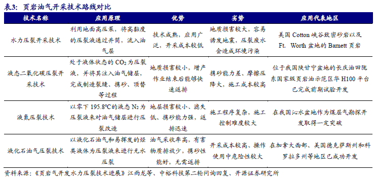相较于其他几种页岩油气开采技术路线,水力压裂开采最大的优势在于技术成熟,使用广泛,开采的成本较低。水力压裂技术的缺点在于容易造成地质损害,诱发地震等,同时压裂废水会造成一定环境污染。相较于其他技术的工艺不成熟、危险性较大、施工程序复杂和开采成本高等劣势,水力压裂开采技术仍是目前境内外页岩油气开采的绝对主流方式,在可预期范围内被其他技术路线替代的风险较小。