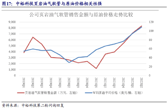 同样的,油价也间接影响着整个产业链物资的消耗。根据中裕科技第二轮问询回复,公司页岩油气压裂供水软管销售金额与原油价格走势相关性较强。国际油价和页岩油的开采成本共同决定了页岩油气开采行业的开工率,当WTI原油价格低于开采成本时,页岩油气行业的开工率下降,下游页岩油气开采配套服务商对相关软管产品需求量减少,公司的页岩油气压裂供水软管销售金额也随之减少;当 WTI原油价格恢复上涨,高于开采价格时,页岩油气开采行业的开工率回升,下游页岩油气开采配套服务商对相关软管产品需求增加,公司的页岩油气压裂供水软管销售金额随之增加。