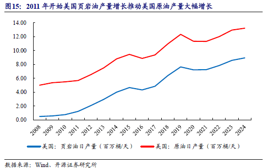 水力压裂技术是美国实现“页岩油气革命”的关键。2011年开始,得益于水力开裂技术的大规模应用,页岩油产量增长推动美国原油产量大幅增长,促使美国成为世界上最大的产油国;2024年原油日均产量达到了1321万桶/天。美国页岩油资源的开发改变了全球能源格局,2016年,美国首次出口页岩气,2018年,美国首次成为石油净出口国。