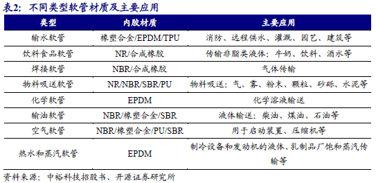 橡胶软管广泛应用于矿业开采、农业、基建、化工、食品饮料、消防、医药和汽车等行业,运送物质包括:水、油、高温水和蒸汽、气体、食品、饮料、化学品等。从软管材料来看可分为天然橡胶管、聚氨酯管、丁腈橡胶管、橡塑合金管等。