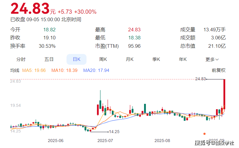 2025年9月5日,北交所上市公司派特尔(股票代码:836871)强势涨停,收盘价24.83元,单日涨幅高达30.00%。